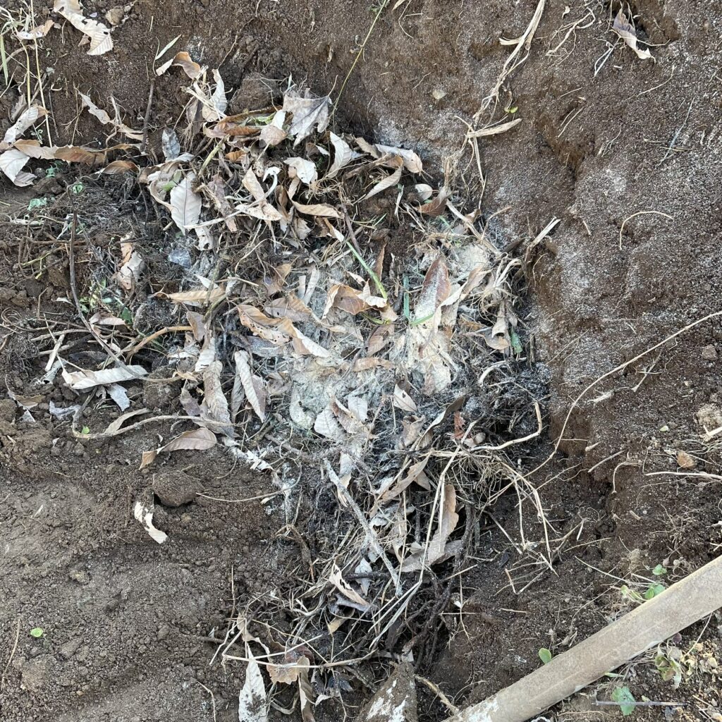 落ち葉や残渣で穴を塞ぎ、