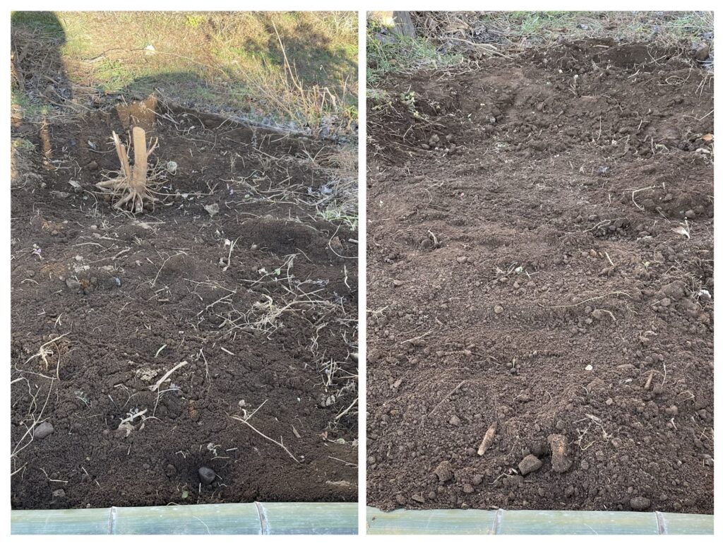 ・背景:レモンを土手に植えようと思い、土手を切り拓いていく。今回は土壌づくりを狙い、伐根あとに米ぬかを投入した。画像も本文も極めて地味ですが、土手が開けてきました。