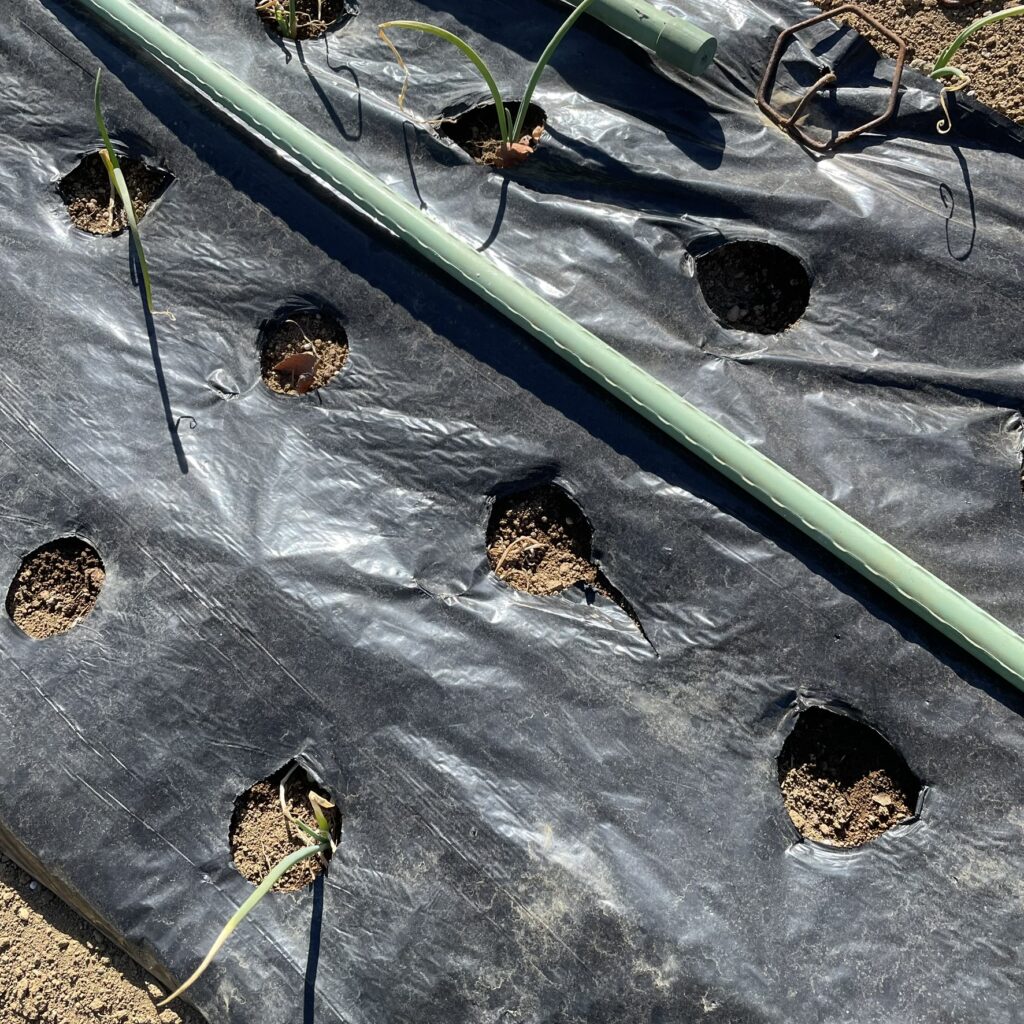 穴あきマルチを張り、一本ずつ差し込んでいく。