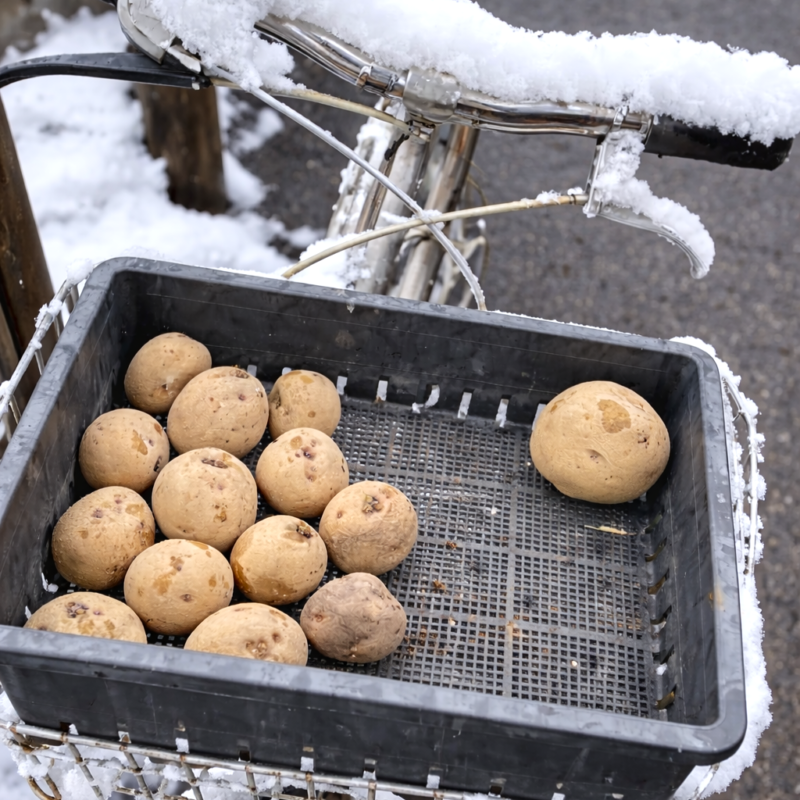 2026年2月、鎌倉の市民農園。早植えを考えながら、種芋を運ぶ。