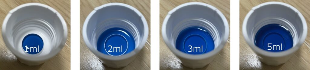 続けて、1ml、2ml、3ml、5mlと段階的にキャップに入れてみる。