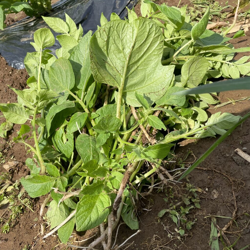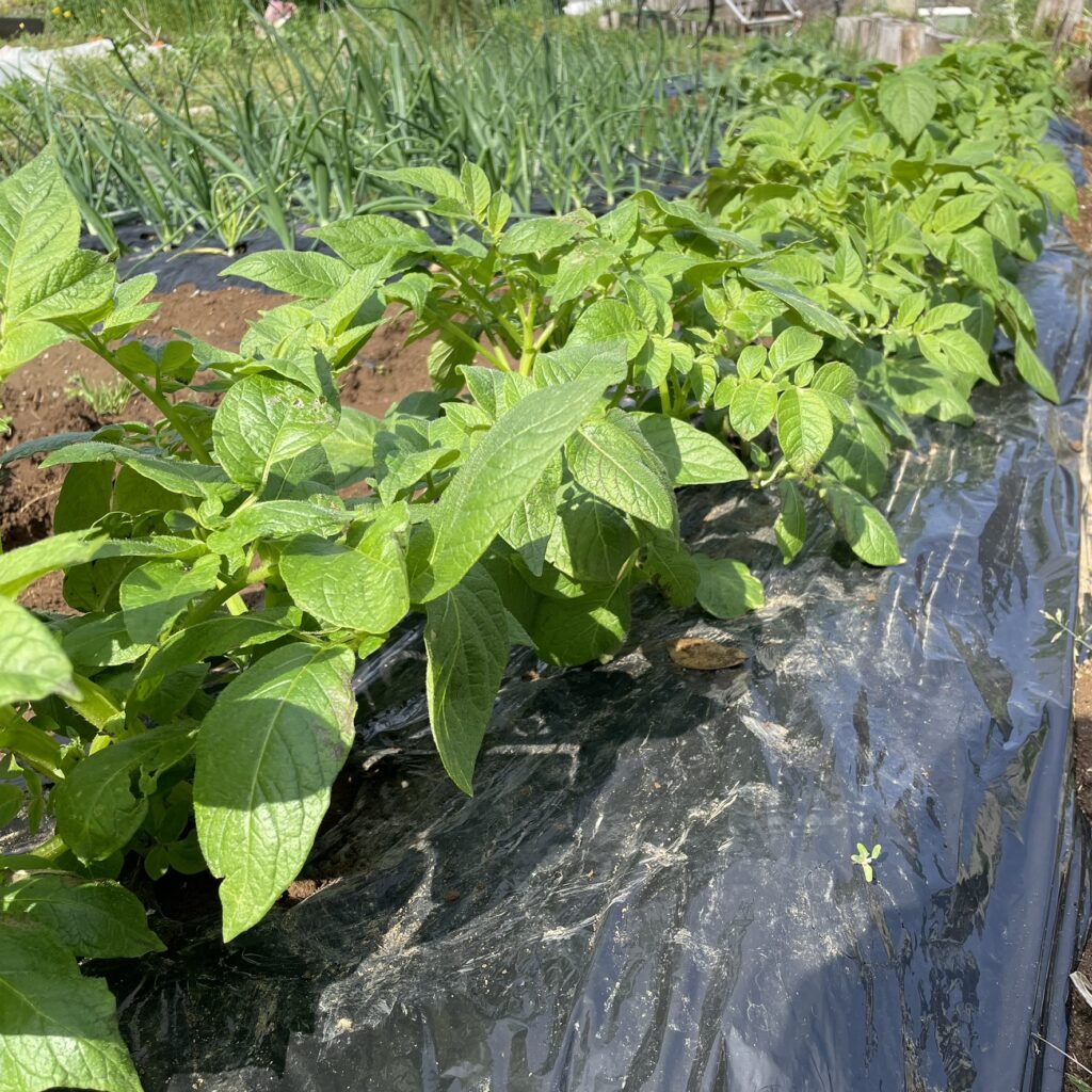 背景:大根の後作として植えたジャガイモが順調に立ち上がり、芽の選別の時期を迎えた