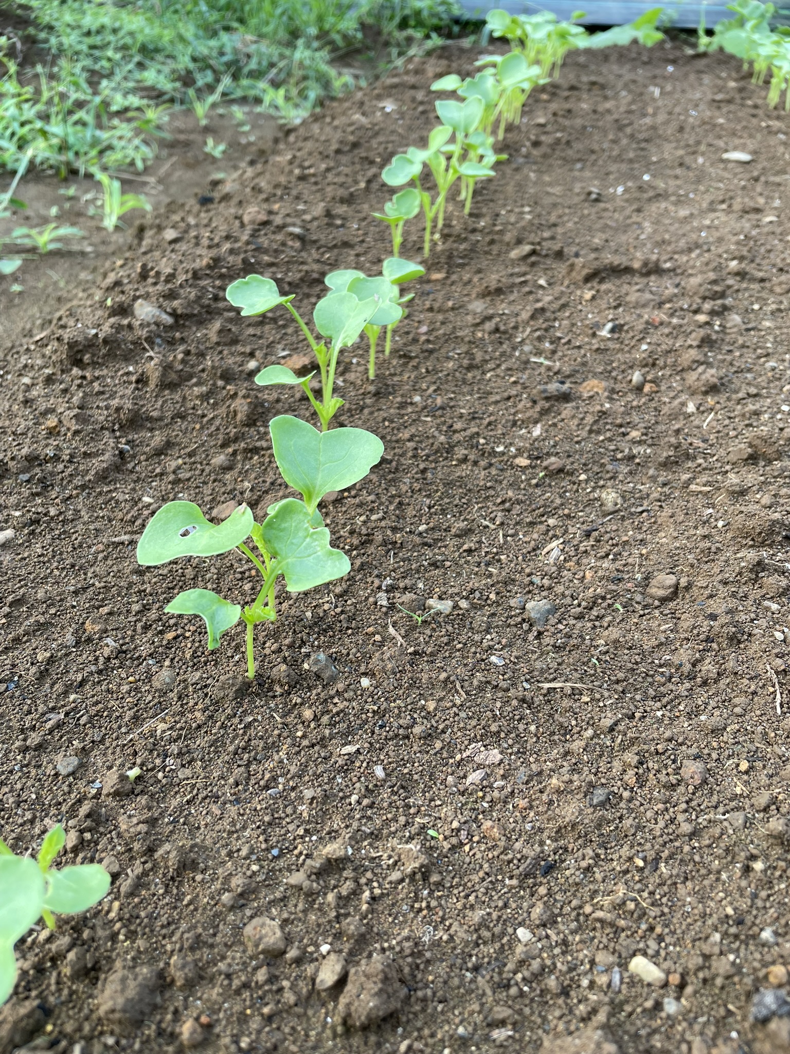 今朝、畑に足を踏み入れると、整えた畝に沿ってずらりと並んだ双葉が迎えてくれた。