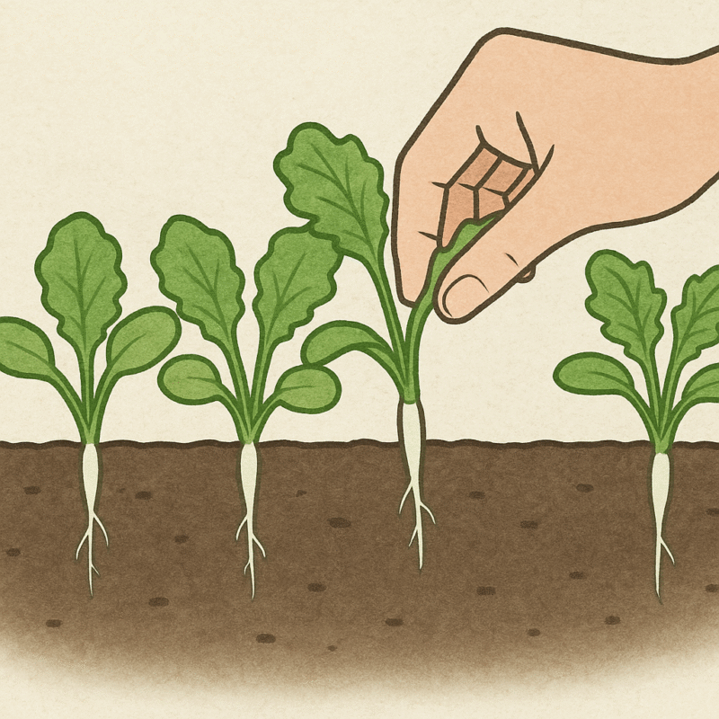 根が十分に伸びず、寄り添って2本の細い大根や二股大根になってしまうことも少なくありません。だからこそ、間引きは「泣く泣く抜く」作業であると同時に、「元気な株を育てるための決断」でもあります。