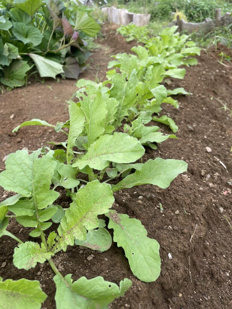 大根が始まる、秋が来るはず、今日も暑かった。が、ゆっくりと季節の移ろいとともに少しずつ畑の景色が変わってきました。種をまいた日から1週間後には小さな芽が揃って顔を出し、畝がうっすらと緑色に染まっていきました。あれからさらに1週間が経ち、本葉が2〜3枚ほどに育ったところで、いよいよ「1回目の間引き」のタイミングです。