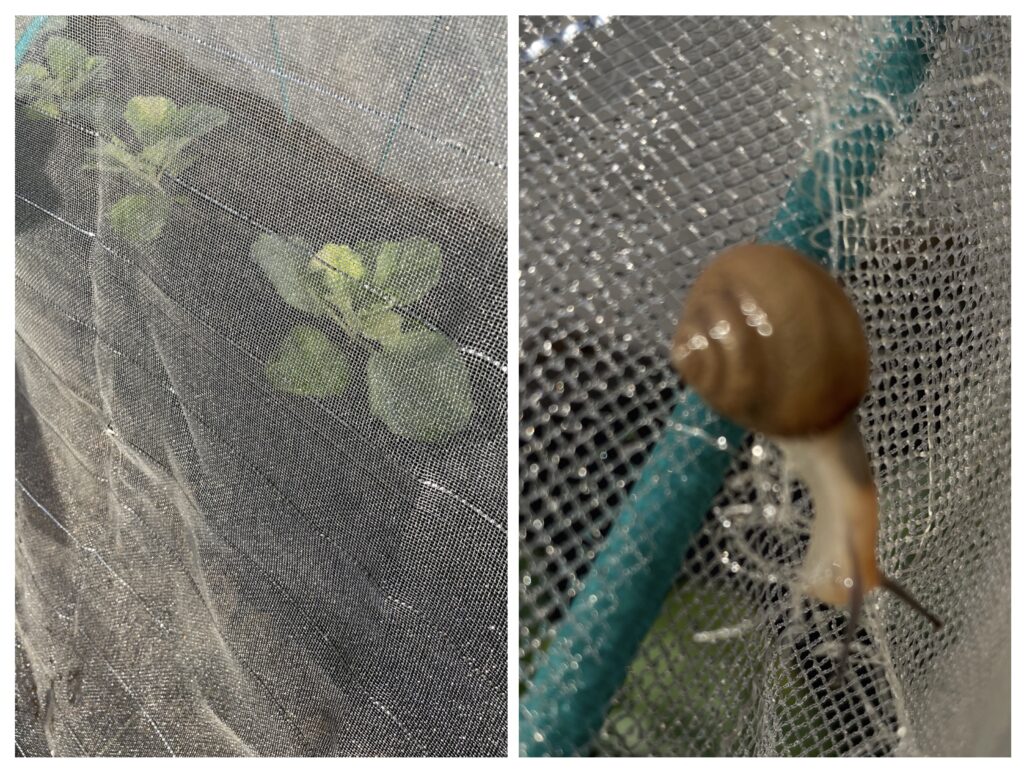 夏の間に勢力を増したナメクジやカタツムリは、秋になるとネットのすそや支柱を伝って忍び寄ります。