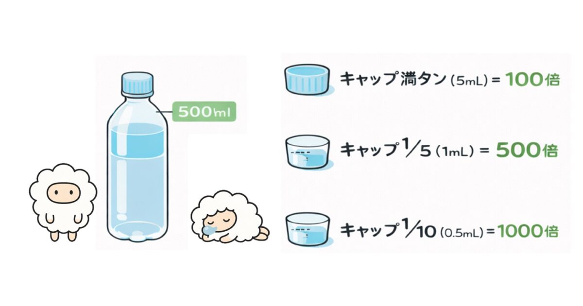 この「キャップ1杯=約5mL」を基準にして、希釈倍率を考えるとこうなります。