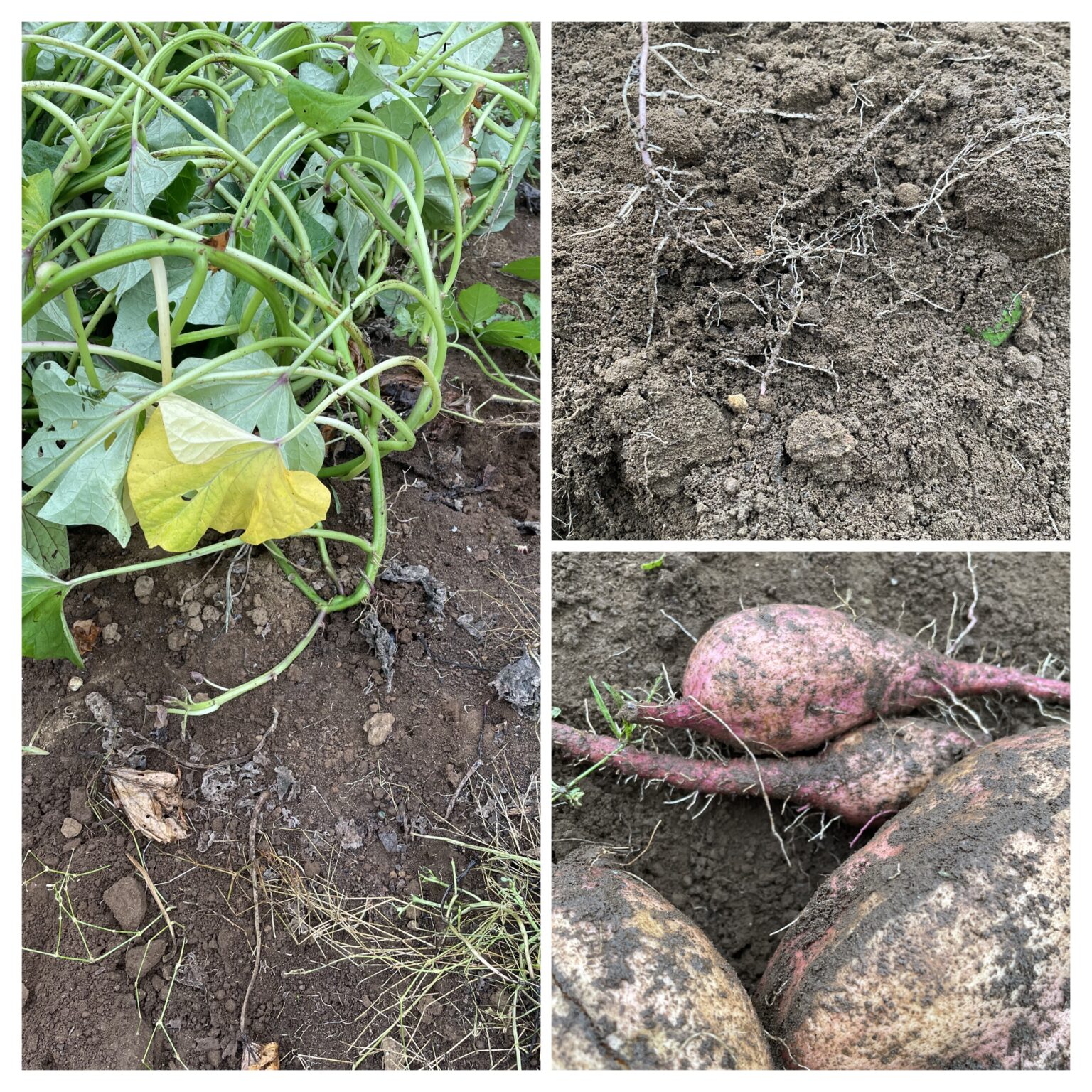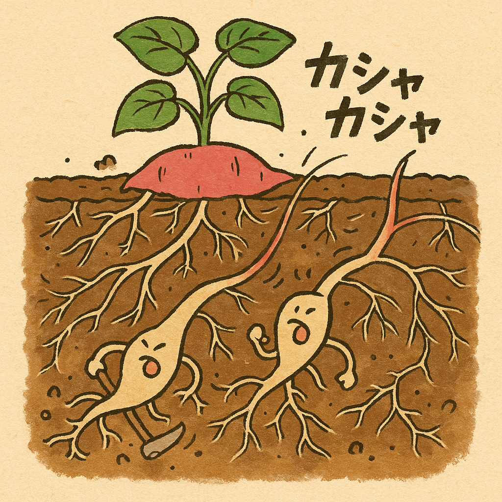 さつまいもの根は意外に強く、土の団粒構造を壊さずに押し広げます。